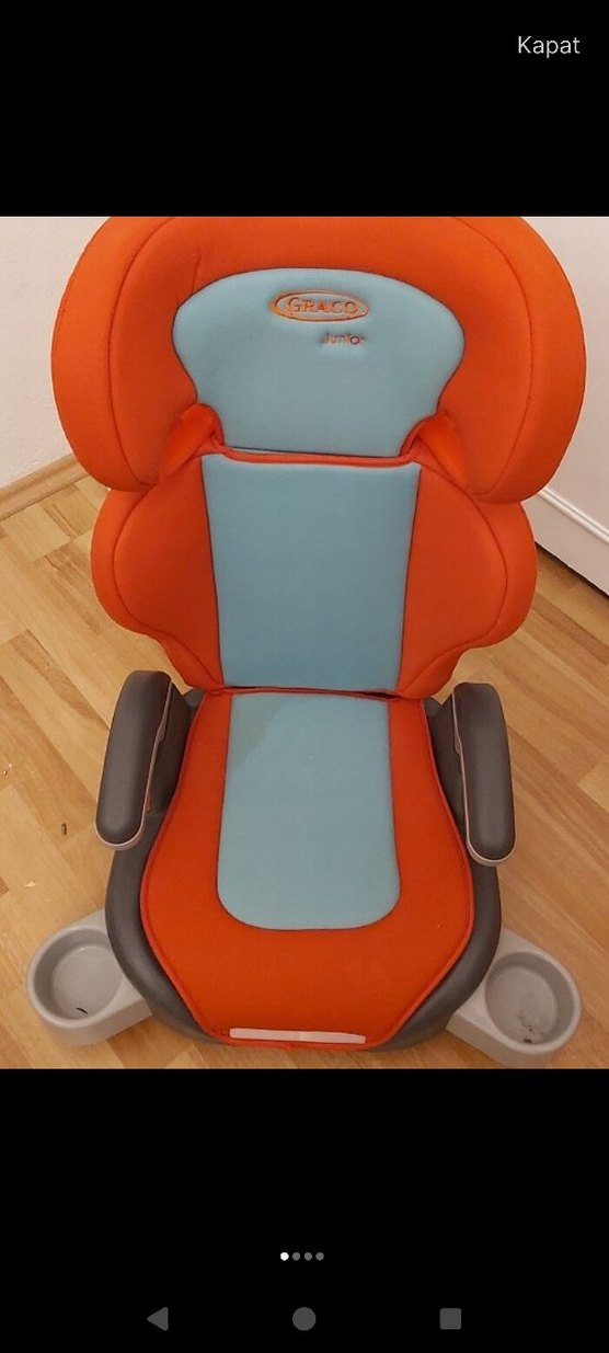Graco markalı çocuk oto koltuğu, turuncu ve gri renklerde yumuşak destekli ve kol dayama yerli tasarıma sahiptir. Seyahat için bardaklıkları bulunmaktadır.