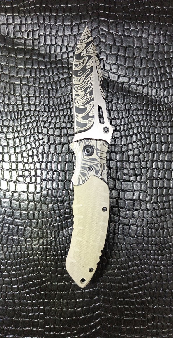 Bu katlanır bıçak, beyaz sapı ve gradyan desenli gri bıçağıyla dikkat çeker. Fonksiyonellik ve özgün tasarımı bir arada sunar.