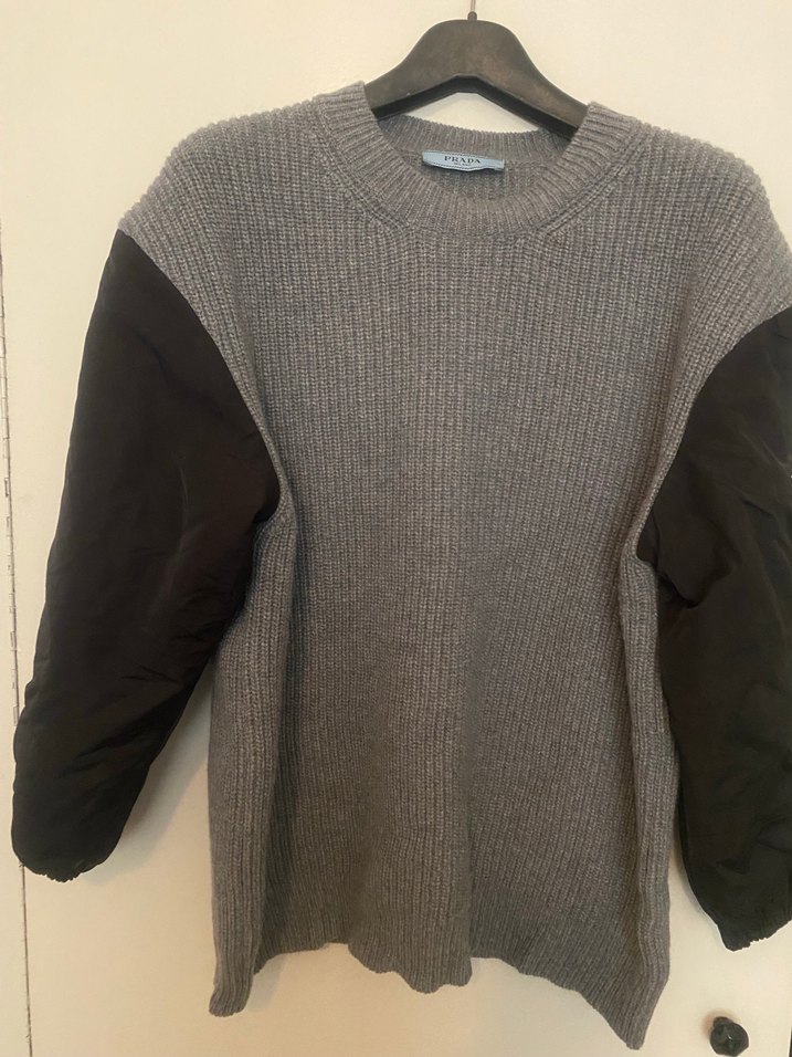 Orjinaldir.. gri örgü gövde ve siyah uzun kollara sahip kazak. Yuvarlak yaka, bol ve midi boyda, günlük kullanıma uygun. Az kullanılmıştır