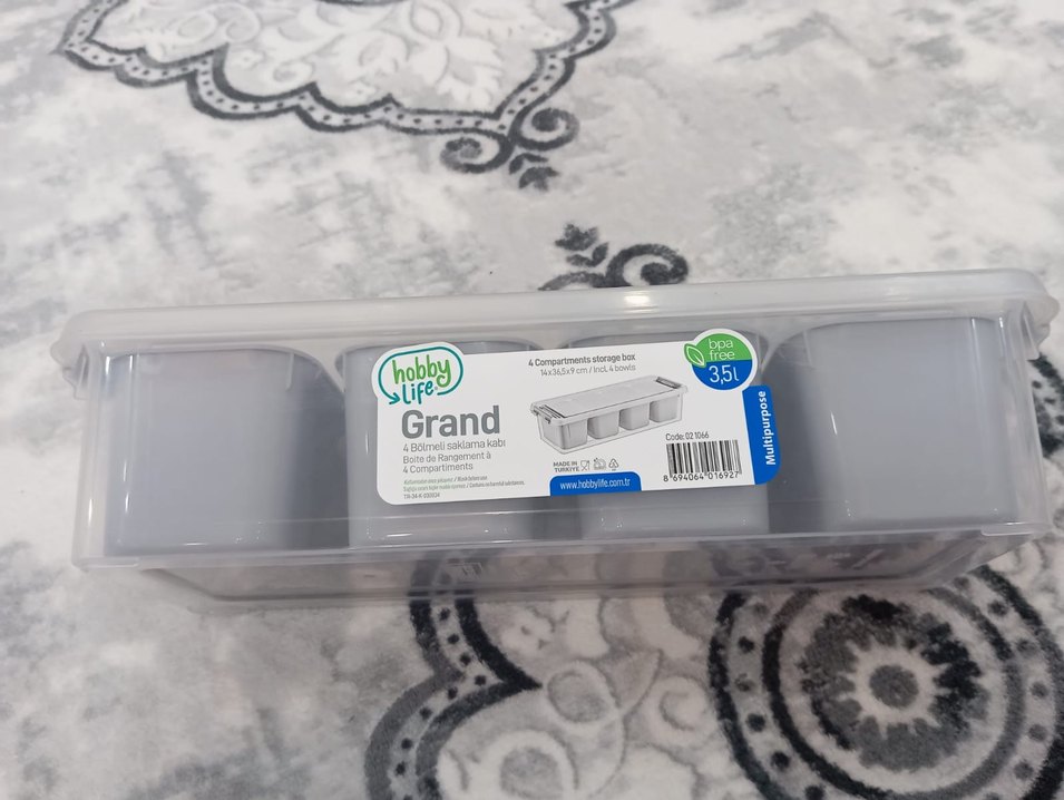 Hobby Life Grand saklama kabı, dört bölmeli ve 3,5 litre kapasitelidir. BPA içermeyen malzemeden üretilmiştir, düzenli saklama için uygundur.