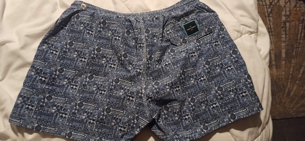 GRAND SASSO marka Bohem desenli, düğmeli ve rahat kesimli erkek mayo. Mavi ve gri tonlarda midi boy, günlük kullanıma uygun.