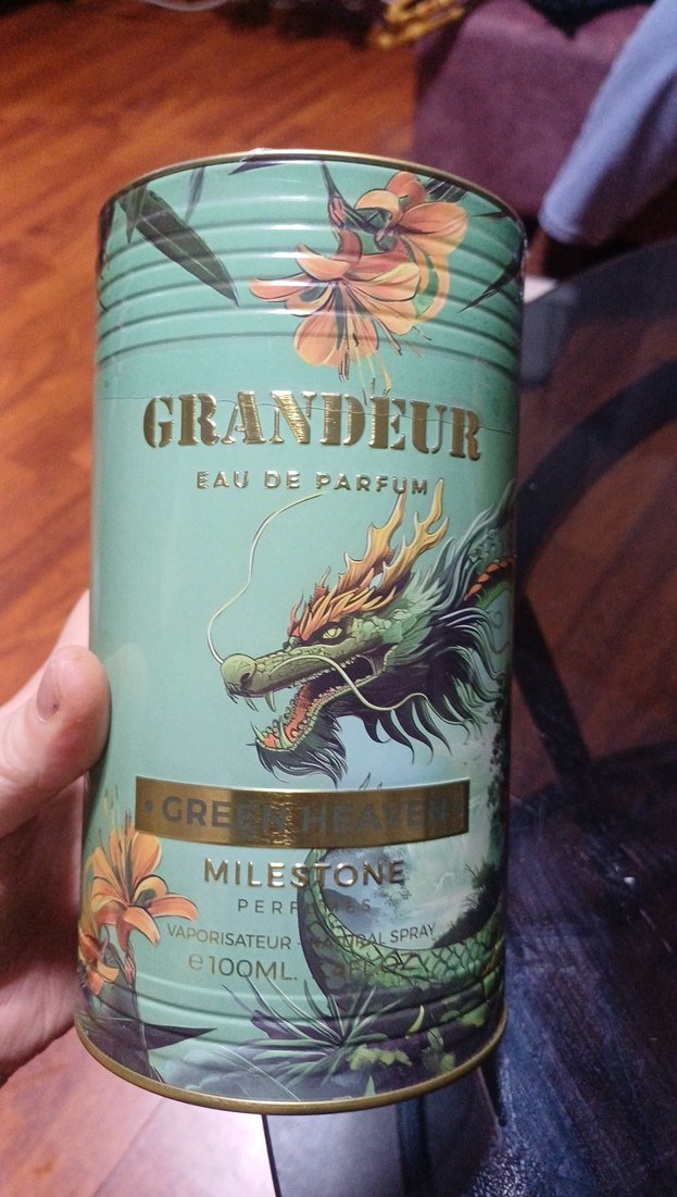 Grandeur Green Heaven erkekler için 100ml sprey parfüm, çiçek ve ejderha desenli haki ve gri tasarıma sahip, Parisli karşı kültür stilini yansıtıyor.