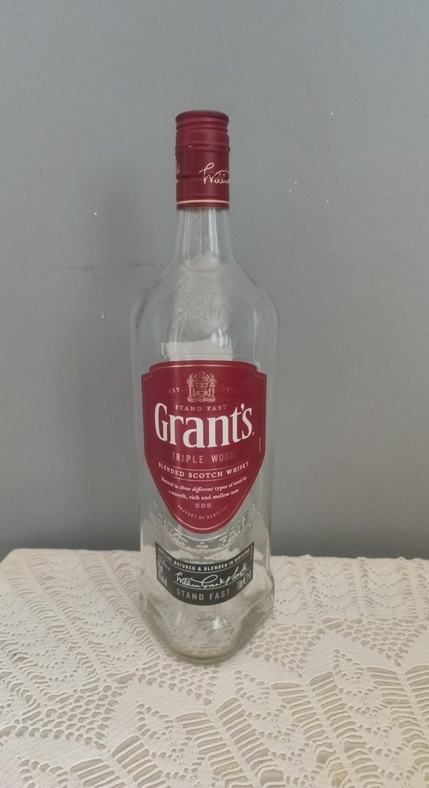 Bordo ve gri etiketlere sahip vintage tarzı Grants Triple Wood harmanlanmış İskoç viski şişesi, klasik bir karşı kültür görünümü sunar.
