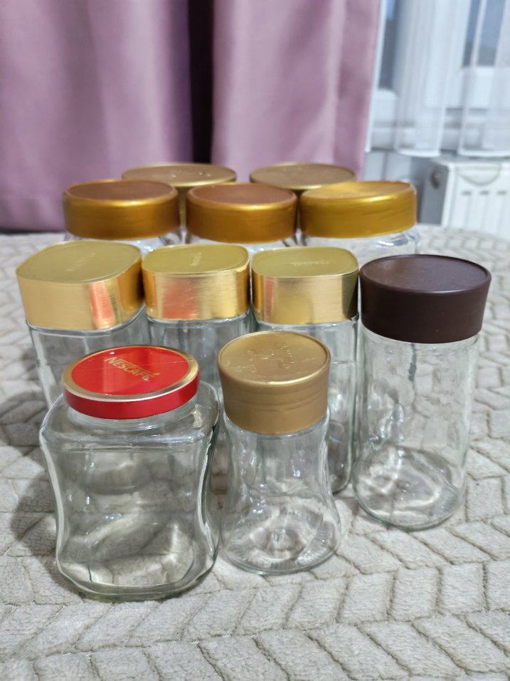 Granül kahve Cam Kavanozlarltın renkli kapaklara sahip farklı boyutlarda cam baharat kavanozları. Mutfakta saklama için uygundur.