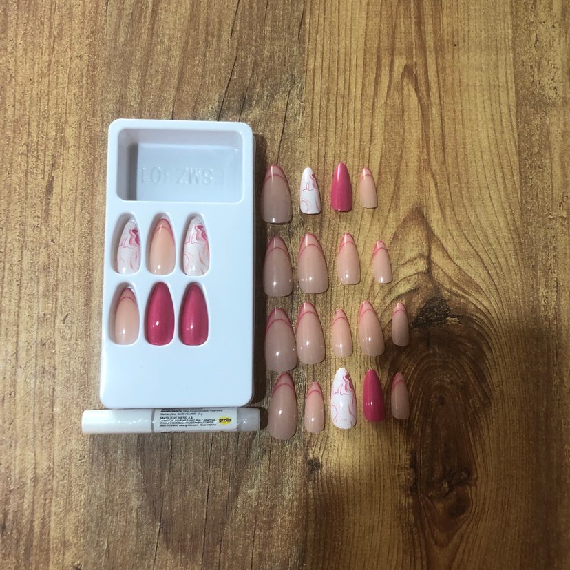 Farklı pembe tonları ve mermer desenleri içeren tırnak süsleme seti, beyaz tırnak kalemiyle birlikte gelir.