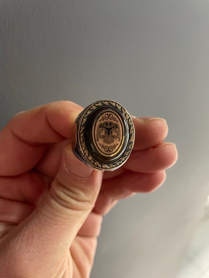 21 parmak ölçüsü 22.11 gr toplam ağırlık Selçuklu kartal motifli gravür işleme sanatı kullanılmış alparslan imzalı kasa içi dolu Muntazam ağır 925 ayar gümüş yüzük.
