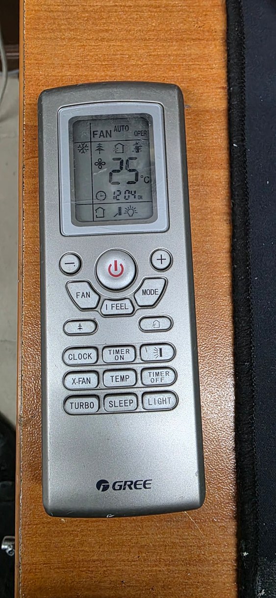 Gri renkli Gree marka klima kumandası, LCD ekranda sıcaklık ve fan, turbo, uyku, zamanlayıcı gibi mod seçenekleri bulunur. ❄️