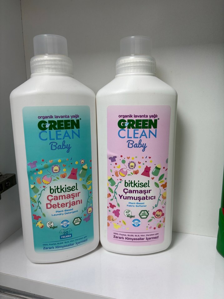 Green Clean Baby organik lavanta yağı içeren bitkisel çamaşır deterjanı ve yumuşatıcı, zararlı kimyasallar içermez. Deterjandan biraz kullandım diğeri tam kokusu olmadığı için satıyorum