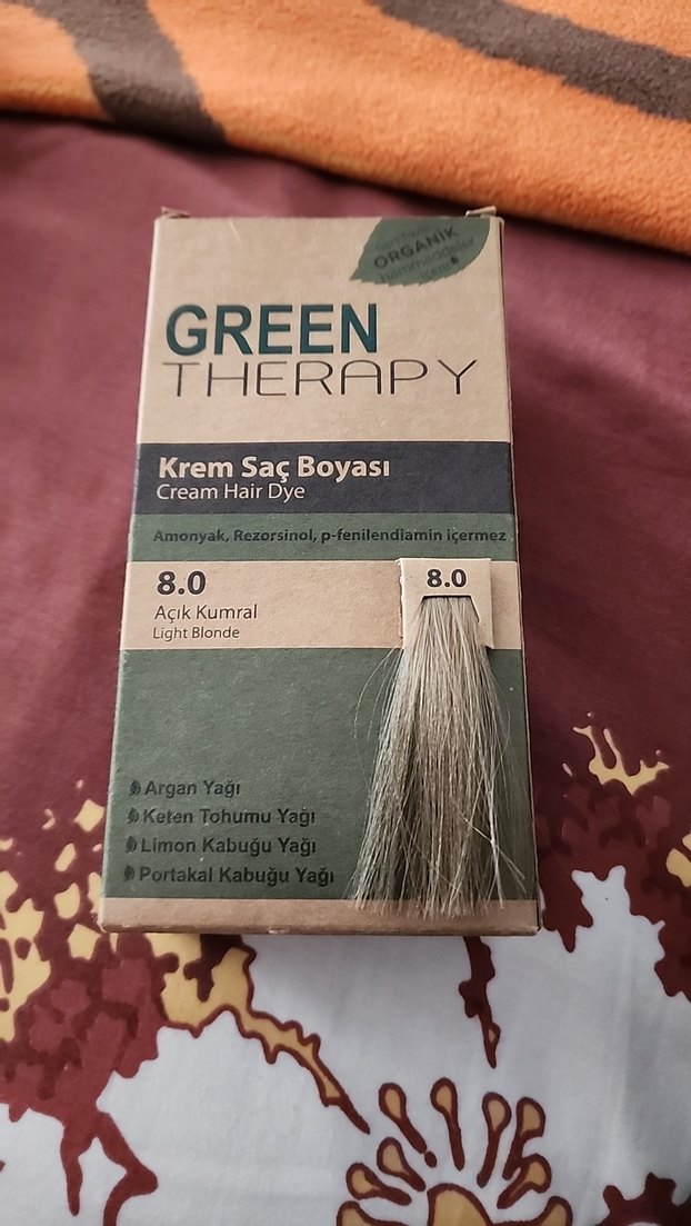 Green Therapy 8.0 Açık Kumral krem saç boyası, argan yağı, keten tohumu yağı, limon ve portakal kabuğu yağları içerir.