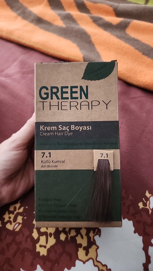 Green Therapy krem saç boyası 7.1 Küllü Kumral tonu, argan yağı içeren besleyici formülüyle doğal küllü kumral renk sağlar.