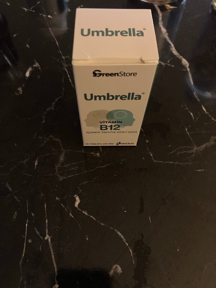 GreenStore markalı Umbrella Vitamin B12 takviye ürünü, koyu yeşil ambalajda. Günlük B12 vitamini desteği sağlar.