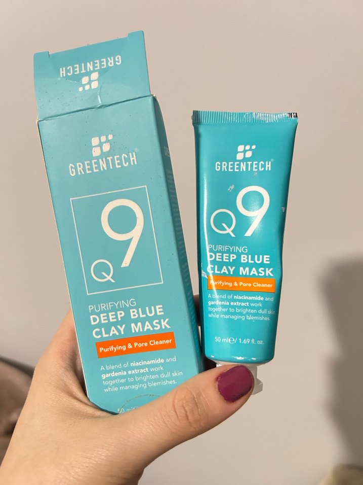 Greentech Q9 Derin Mavi Kil Maskesi, niasinamid ve gardenya özü ile gözenekleri temizler, mat cildi aydınlatır. 50 ml. Ürün bir kez denenmiştir. Çok kaliteli bir marka araştırabilirsiniz ❤️ #kilmaskesi #greentech #kil #maske #ciltbakım