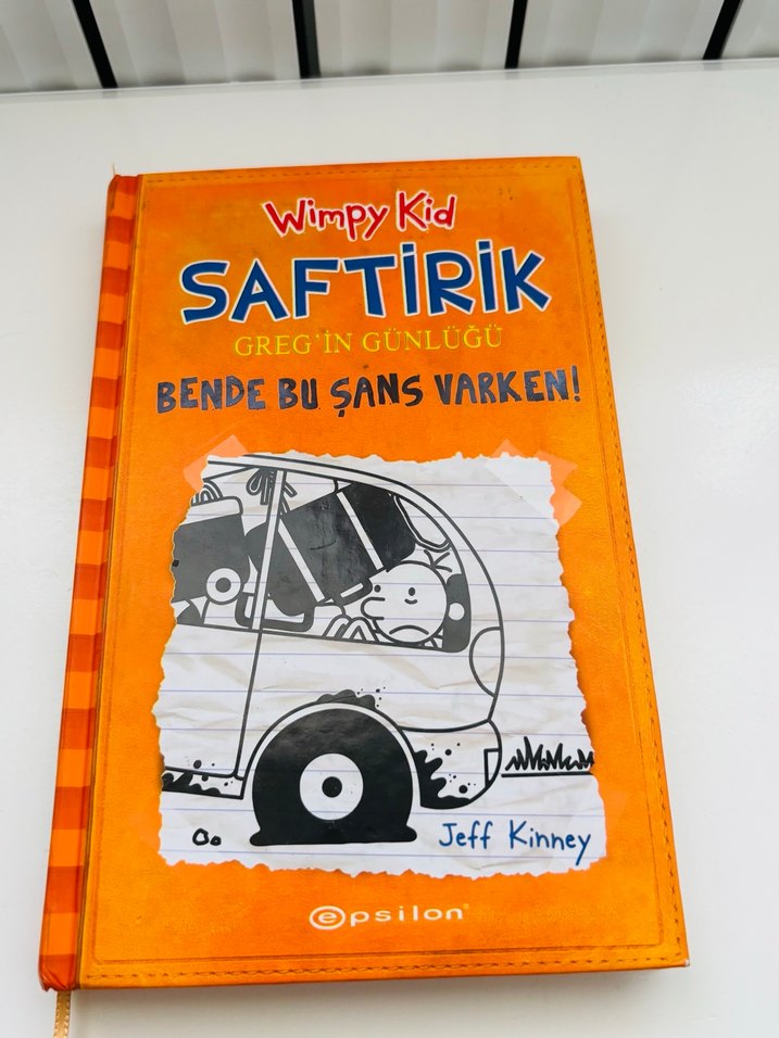 Jeff Kinney'nin kaleminden, Epsilon yayınevinden çıkan "Wimpy Kid Saftirik: Greg'in Günlüğü - Bende Bu Şans Varken" kitabı, çizgi roman tarzı arabalı bir karakter illüstrasyonu içerir.