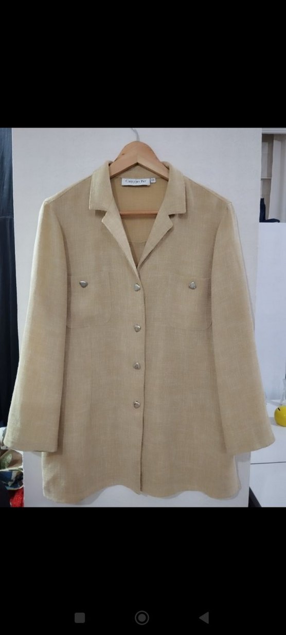 Bej renkli , uzun kollu ve düğmeli önü olan klasik kesim midi uzunlukta kadın gömlek- ceket. Ofis şıklığı için uygun, sade bir tasarım.
