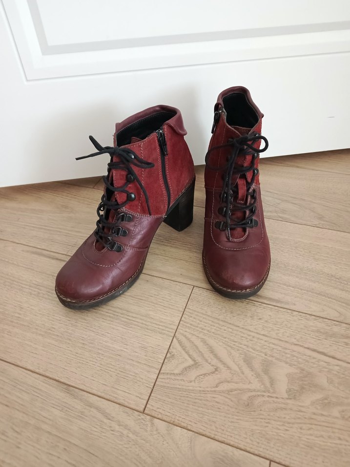 Greyder marka Bordo deri kadın botları, kalın topuklu ve bağcıklı tasarıma sahip. Yan fermuar ve tokalı detaylarla vintage, klasik bir görünüm sunar.