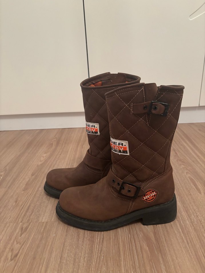 Kahverengi deri, tokalı ve yüksek topuklu biker botlar, kareli desene sahip. Günlük sokak stili için uygun. Orjinal greyder temiz kullanıldı#greyderbot#kadınbot#kadınçizme