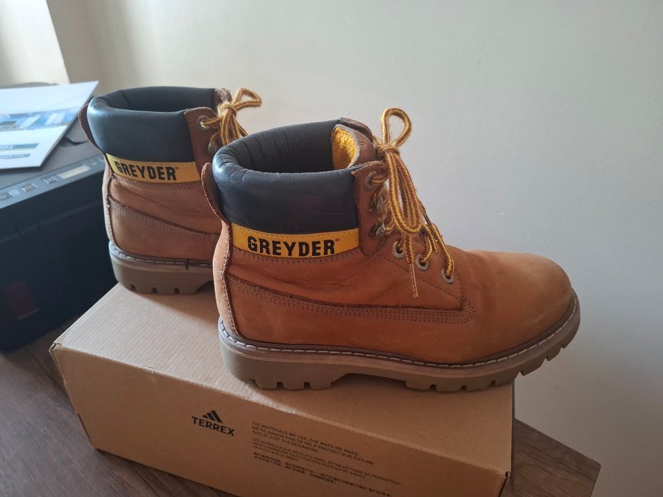 GREYDER marka kahverengi deri kadın bot, gri yastıklı bilek kısmı, dolgu topuk ve tokalı detaylara sahiptir. içinde vs hiçbir yırtık yoktur sadece ön kısmında lekeler var uygun temizlik ile çıkar