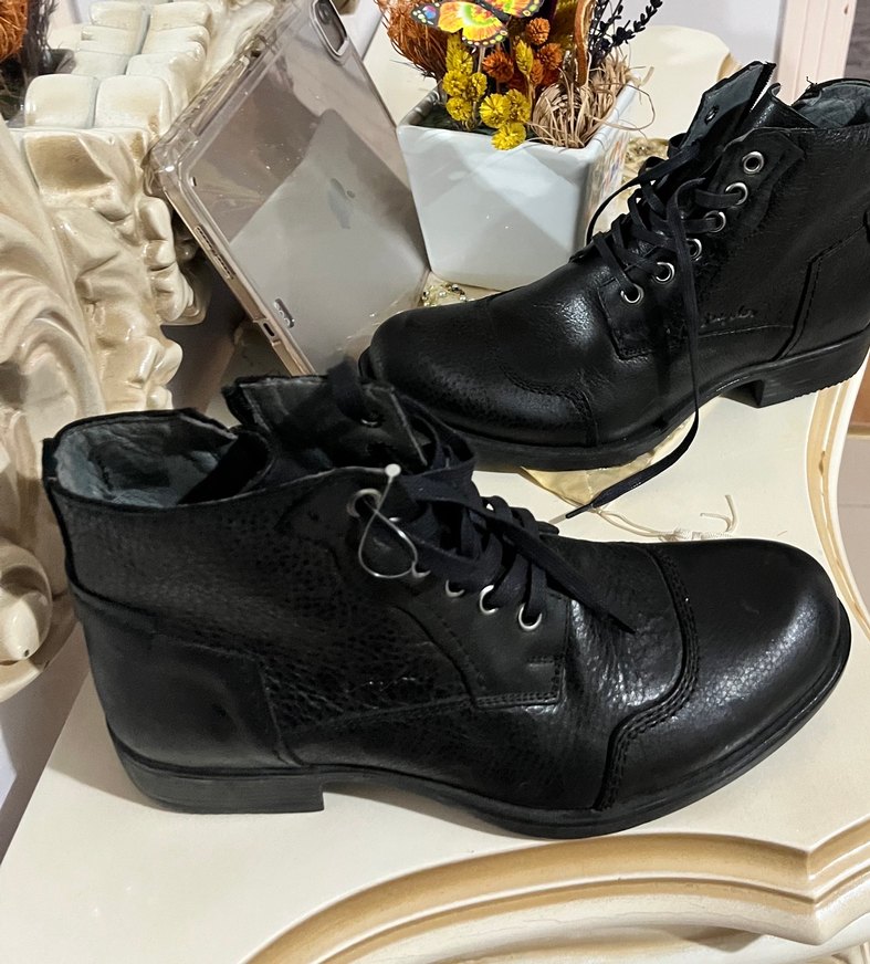 Siyah deri, bağcıklı erkek botları klasik goth tarzıyla. Desensiz ve koyu renk, günlük kullanıma uygundur.