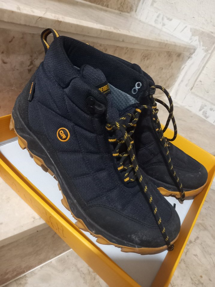 Siyah erkek outdoor botları, koyu sarı kauçuk taban ve bağcıklarla. Ayarlanabilir cırt cırtlı, günlük sokak stili için uygun. Bir defa giyildi son fotoğrafta güncel fiyatına bakarak ona göre tekliflerde bulunun lütfen