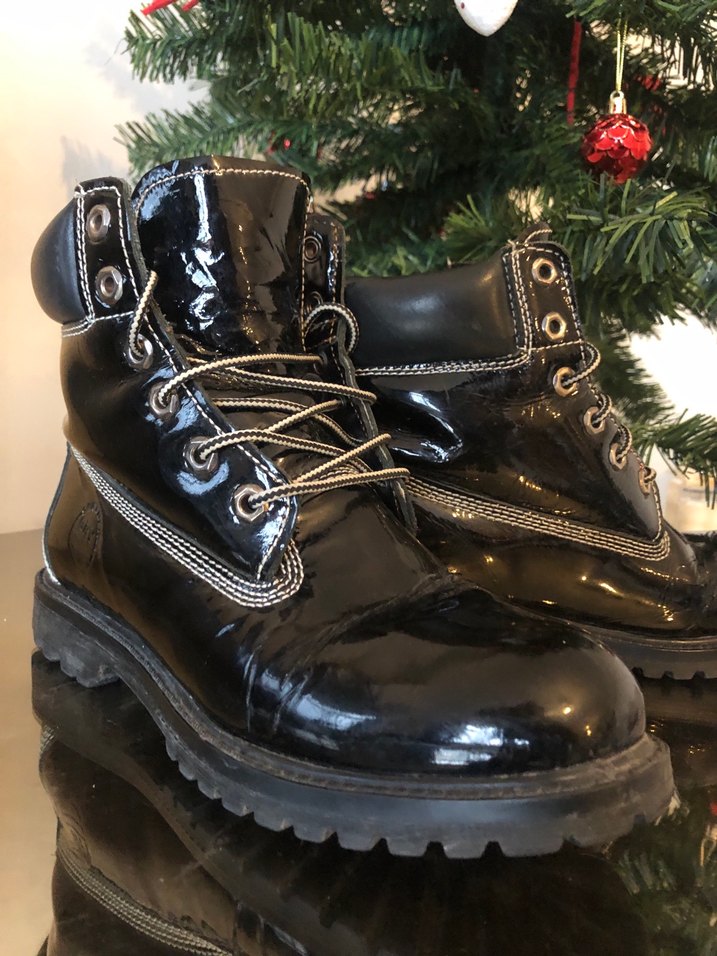 Parlak siyah rugan deri botlar, tokalı ve ince topuklu. Gotik ve grunge punk tarzına uygun, günlük kullanım için ideal.