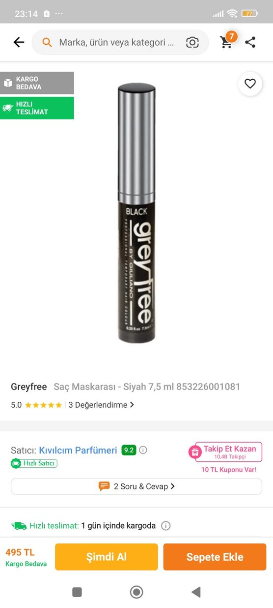 Greyfree siyah saç maskarası, 7,5 ml hacminde, koyu ve doğal kapatıcılık sağlar. Kolay uygulanır ve hızlı dokunuşlar için uygundur.