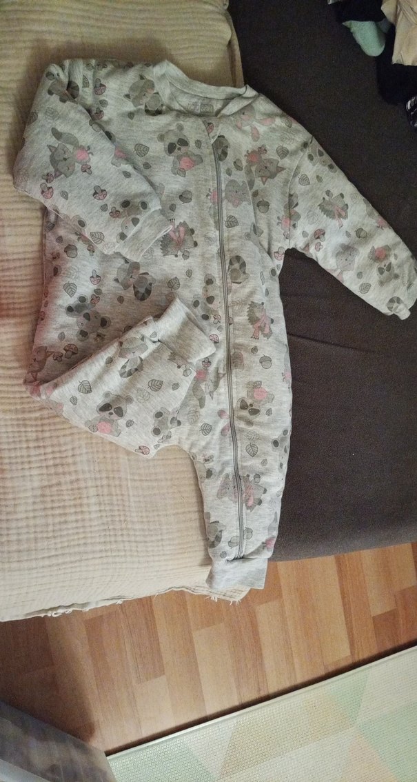 Gri renkte bebek kış tulumu, yumuşak kumaştan ve hafif desenli.