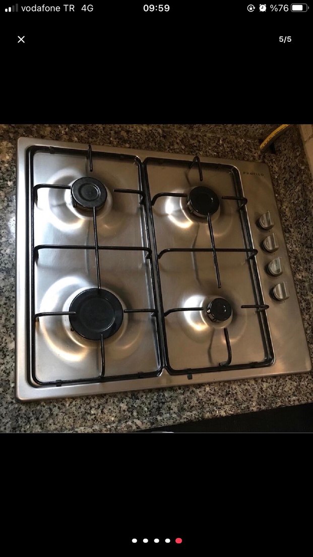 Gri renkli, paslanmaz çelik yüzeyli ve metal ızgaralı 4 gözlü ocak. Yan tarafta 4 adet alev kontrol düğmesi bulunur.