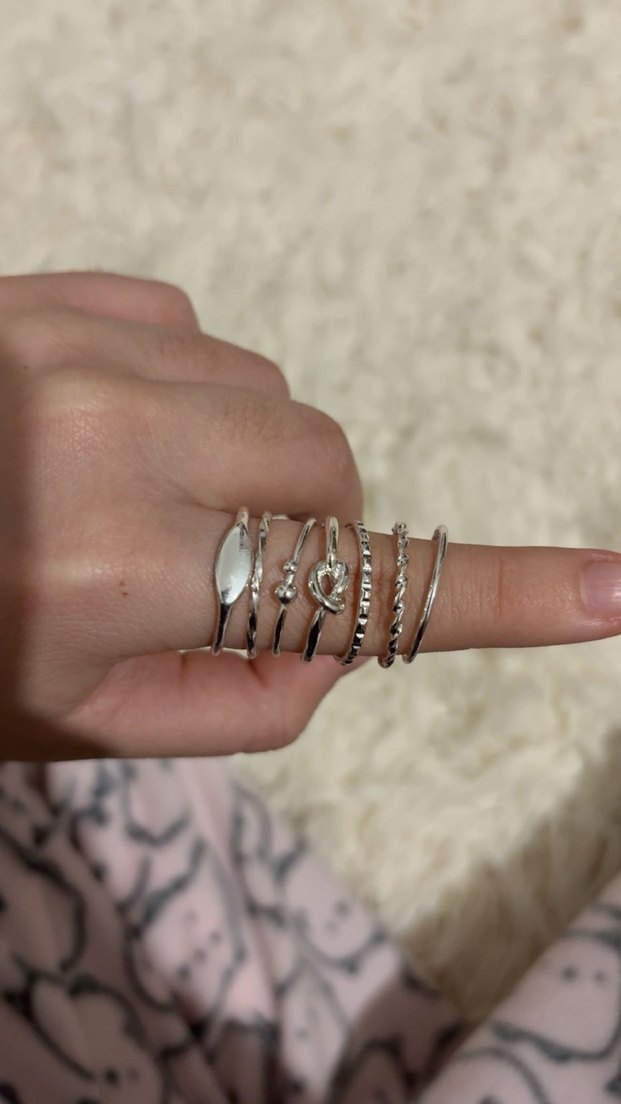 Gri renkte, boncuklu ve minimalist bohem tarzda altı adet yüzükten oluşan set, günlük kullanım için uygundur. Aylar önce H&Mden almıştım.