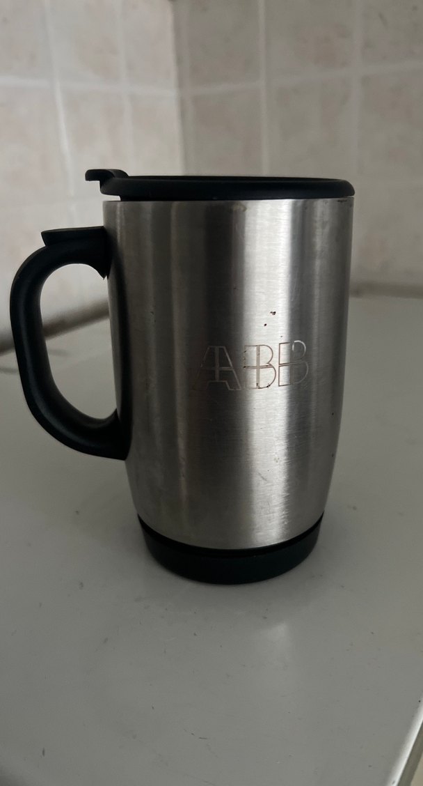Gri renkli, ABB logosu bulunan seyahat termos kupası, sağlam sap ve siyah kapak ile sıcak içecekler için uygundur. ☕