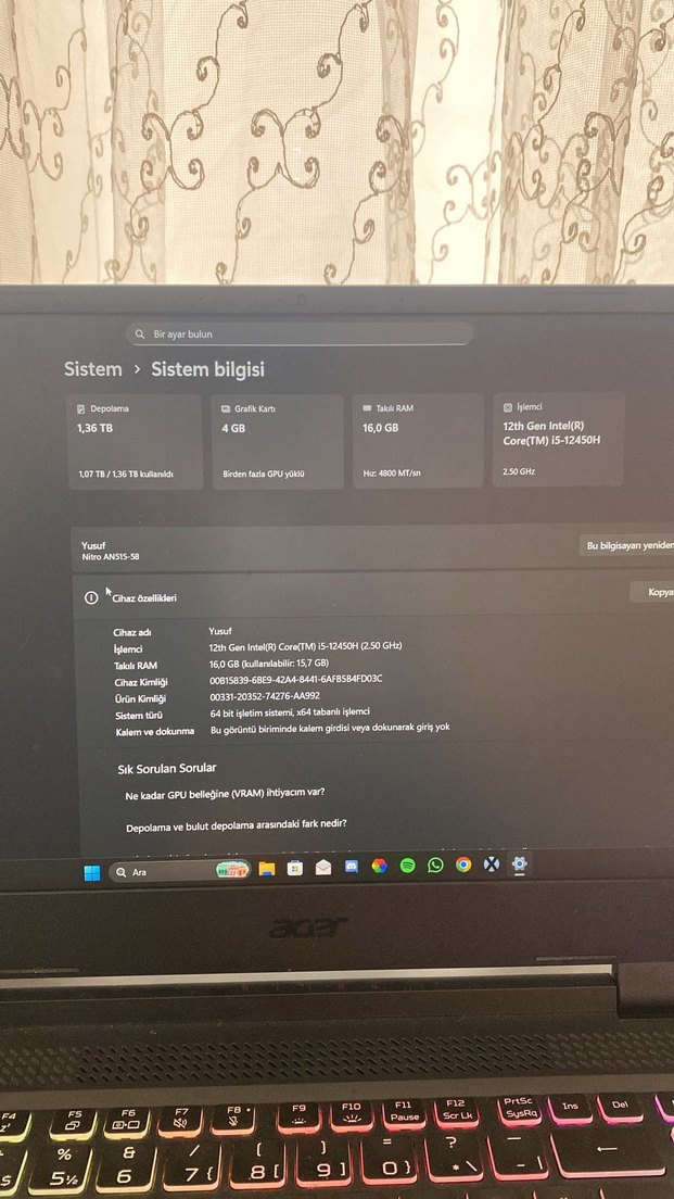 Gri Acer laptop, 15.6 inç ekran, 1.36 TB depolama, 4 GB grafik kartı ve 16 GB RAM içerir. 12.nesil Intel Core i5-12450H işlemciye sahiptir.