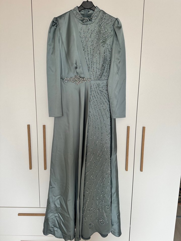 Gri renkte, uzun kollu ve drapeli tasarıma sahip bu uzun abiye elbise, klasik ve modern dokunuşlarla düğünler için uygundur. Notlu yaka ve düzenli kesim sunar. 1 kere giyilmiştir .