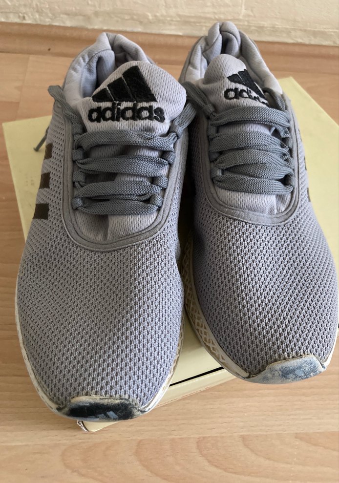 Gri Adidas kadın spor ayakkabısı, bağcıklı ve düz kauçuk tabanlı, sportif ve günlük sokak stiline uygun. ♀️