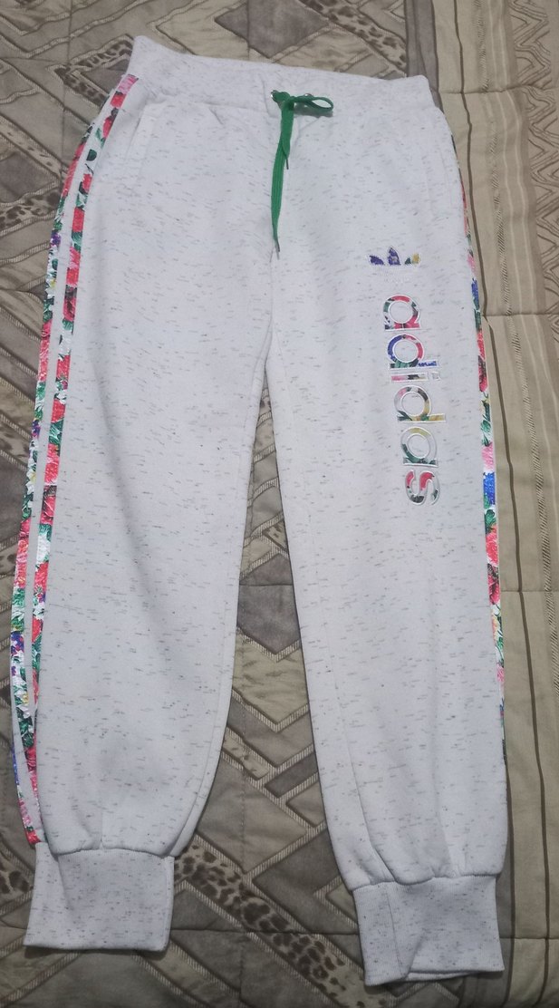 Gri renkte, bol kesim Adidas kadın eşofman altı, elastik bel ve renkli baskılı yan şeritlere sahip, sentetik kumaştan üretilmiştir.