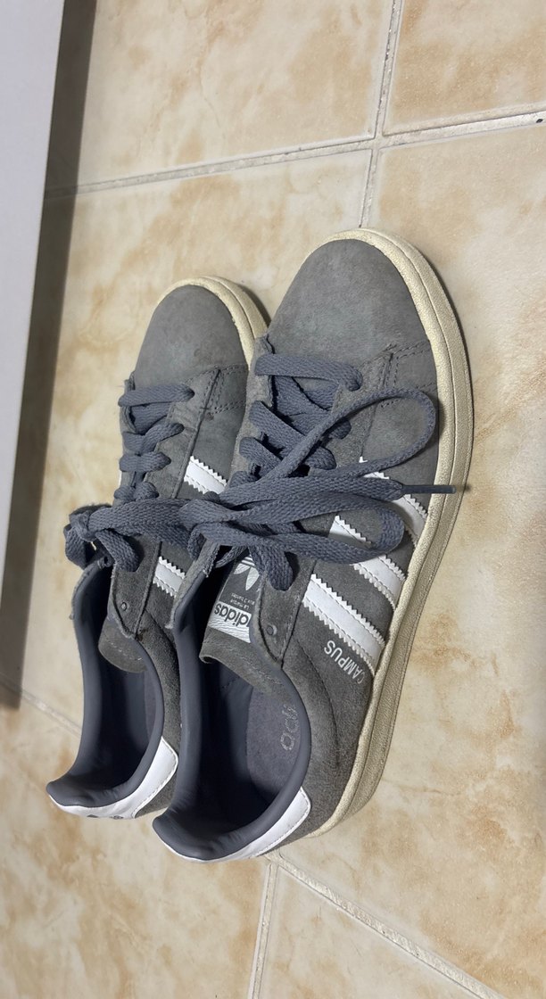 Gri Adidas Campus kadın spor ayakkabısı, bağcıklı ve ince topuklu tasarıma sahip. Kauçuk tabanlı, sokak tarzında ve sportif görünümlü.