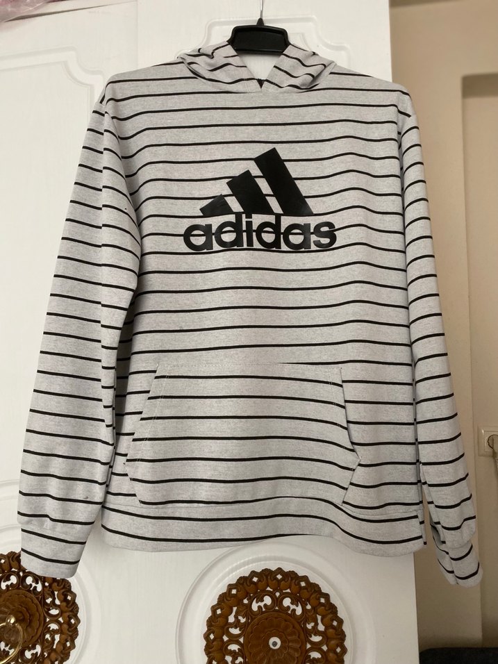 Gri renkli Adidas sweatshirt, uzun kollu ve yuvarlak yaka. Örme yumuşak kumaştan, çizgili baskılı ve bol kesim. Günlük rahat kullanım için uygundur.
