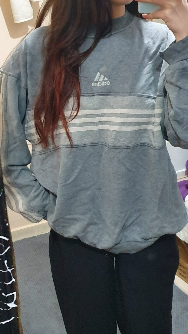 Gri renkli Adidas sweatshirt, uzun kollu ve yuvarlak yakalıdır. Denim kumaş ve ince çizgilerle rahat bir sokak stili sunar. Günlük kullanım için uygundur.