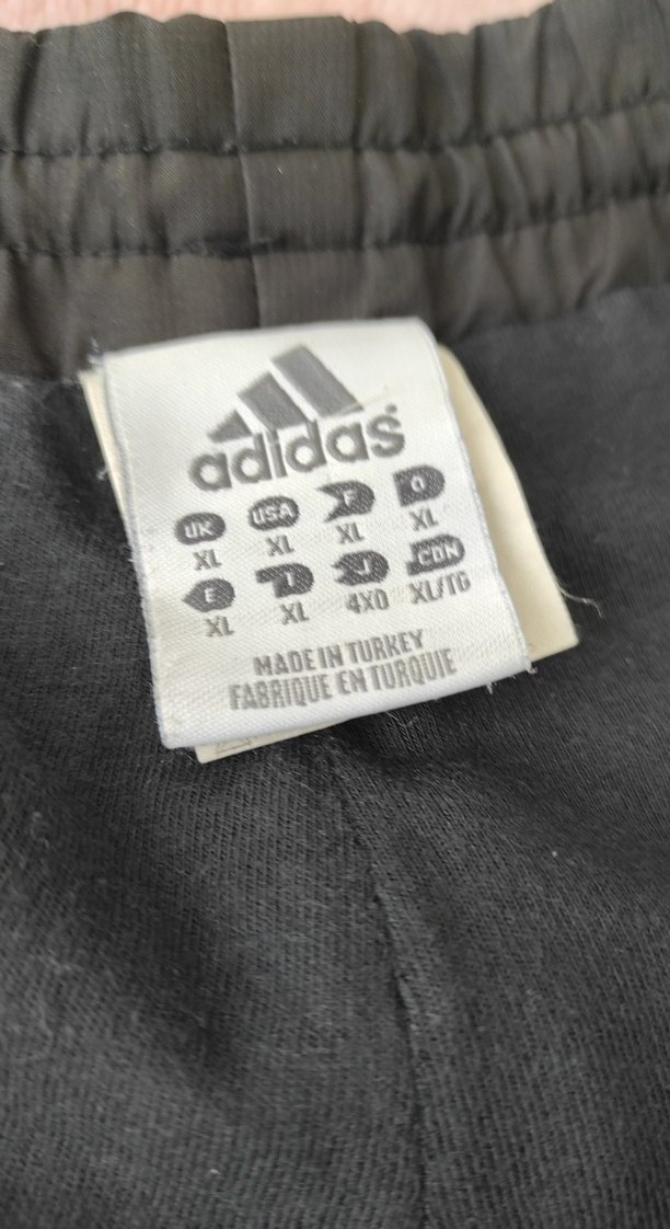 Gri Adidas erkek beden etiketi XL, Türkiye'de üretilmiştir. Farklı bölgeler için beden ve bakım sembolleri içerir. ️