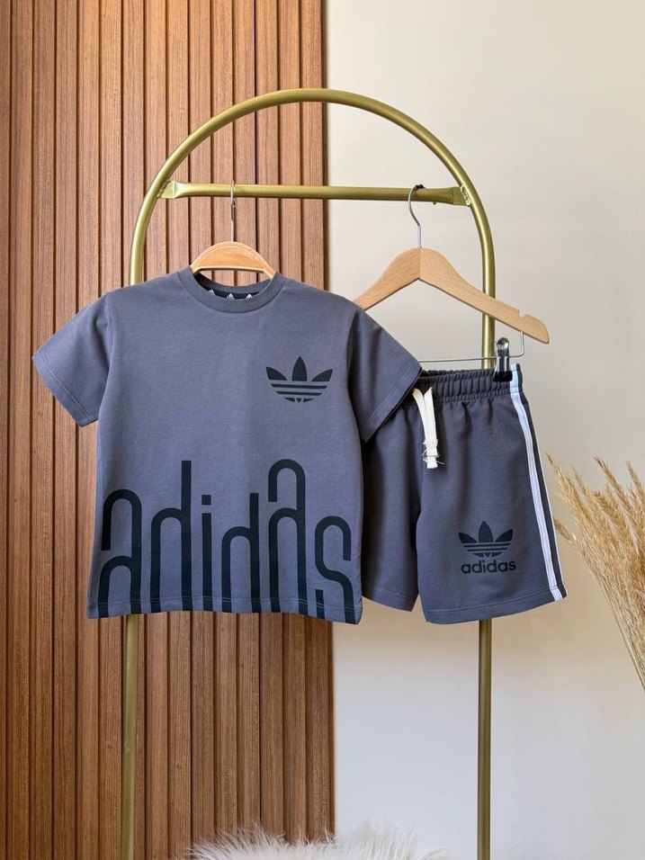 Gri pamuklu oversize tişört ve baskılı Adidas şorttan oluşan erkek çocuk takımı, rahat sokak stili için ideal. 34