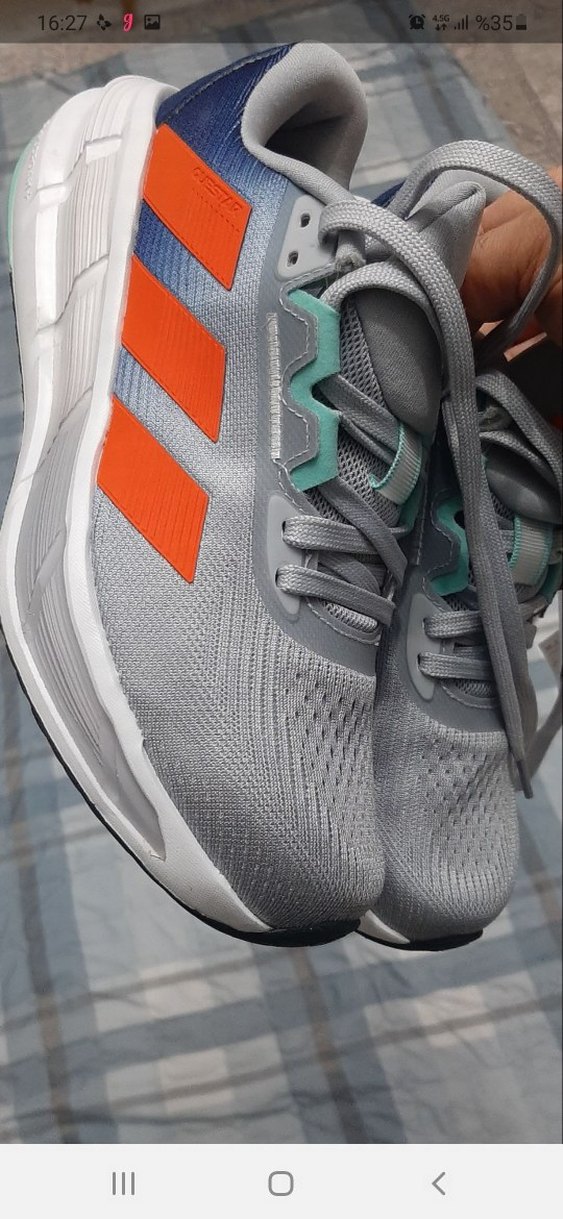 Bağcıklı gri Adidas erkek koşu ve antrenman ayakkabısı, turuncu çizgilerle ve rahat kauçuk tabanla spor ve günlük kullanıma uygun. 42