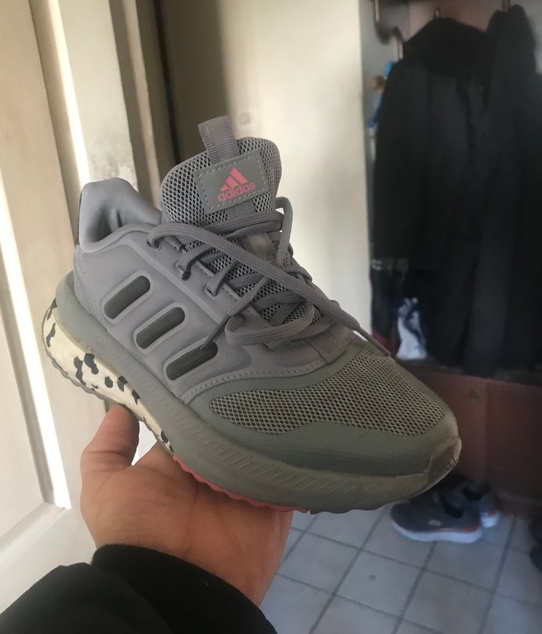 Gri baskılı tasarıma sahip Adidas erkek spor ayakkabısı, bağcıklı ve kauçuk tabanlıdır, sokak stili ve spor görünümler için uygundur.