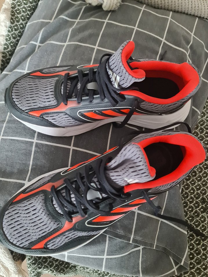 Gri baskılı üst yüzey ve canlı kırmızı detaylara sahip bağcıklı erkek spor ayakkabısı. 39.5 numara 39 numara ayağa çok büyük oldu 40 numara bile giyebilir ürün hiç kullanılmamış ve orijinaldir