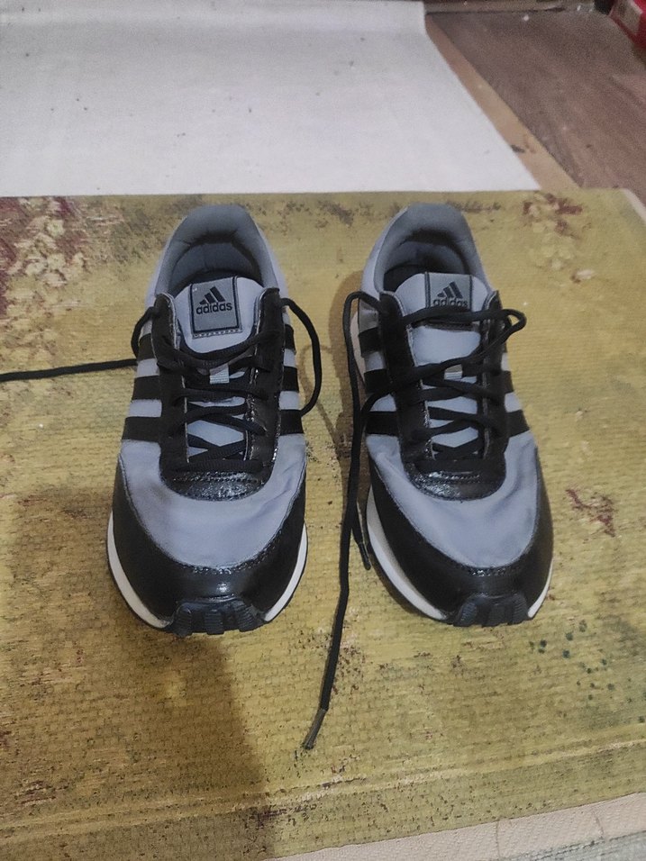 Gri ve siyah detaylı Adidas erkek spor ayakkabısı, rahat ve sokak stiline uygun tasarım.
