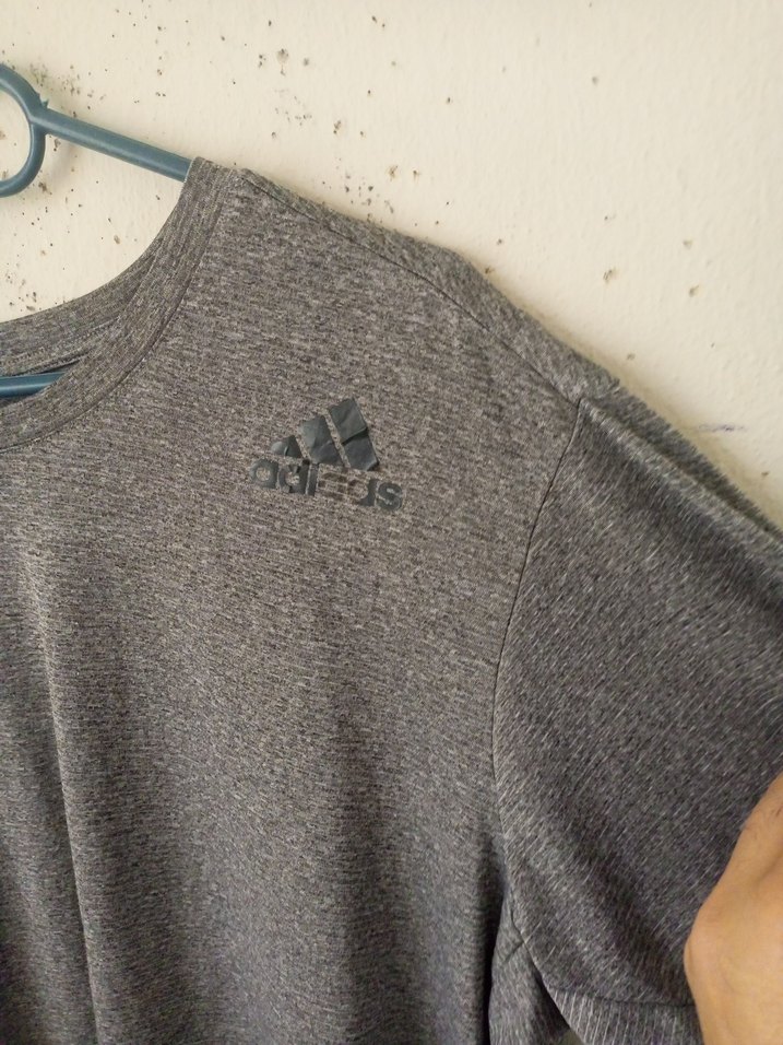 Gri renkli Adidas erkek tişörtü, yuvarlak yaka, kısa kollu ve bol kesimdir. Sentetik kumaştan üretilmiş, Velcro detayı ve baskılı logo içerir. Spor şıklığı için uygundur. ♂️