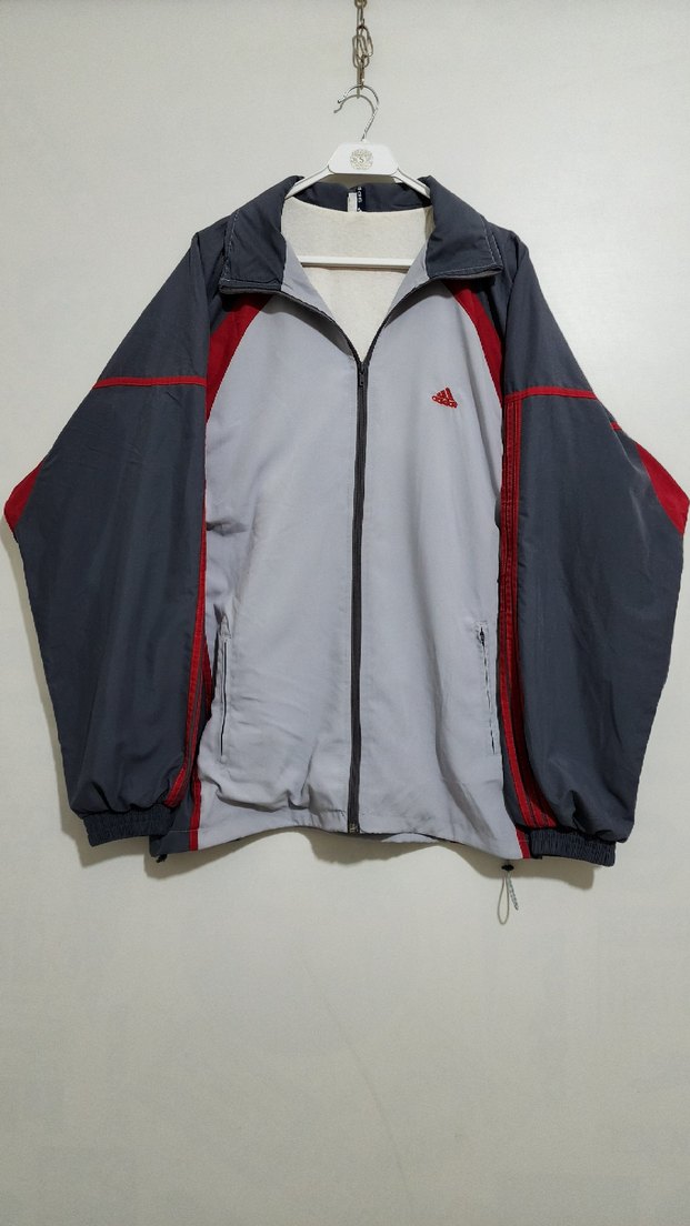 Gri ve kırmızı detaylı, fermuarlı ve yüksek yaka Adidas erkek spor sweatshirtü. Yumuşak fleece kumaştan, bol kesim ve uzun kollu. ♂️