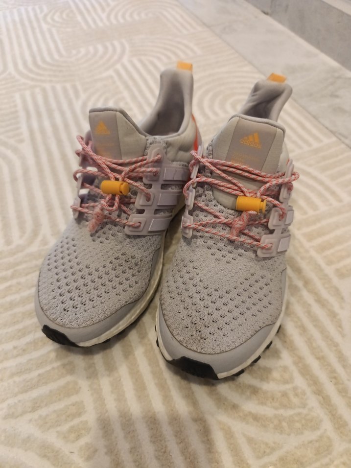 Nefes alabilen örgü üst yüzey ve pembe ayarlanabilir bağcıklarla gri Adidas kadın spor ayakkabısı, streetwear ve athleisure tarzına uygun.bir kaç kere hamilelik giydim ayağıma büyük olduğu için satıyorum. hiç deformesi yoktur. renk gri uçuk mor arası bı renk