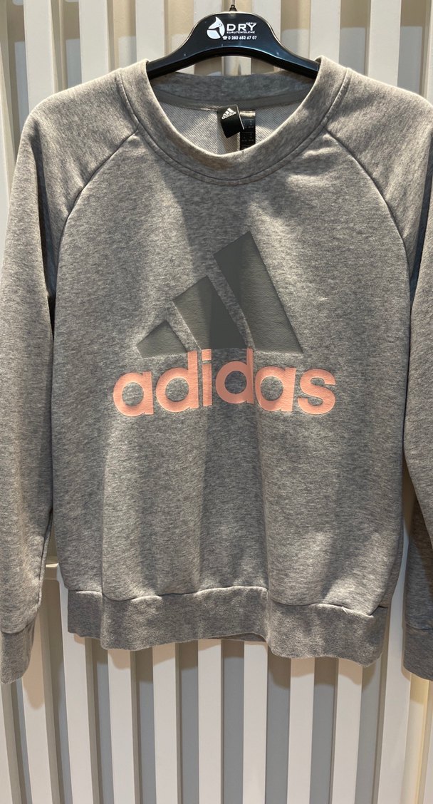 Gri adidas kadın sweatshirt, uzun kollu ve yuvarlak yakalıdır. Sentetik kumaştan, baskılı logo ve cırt cırt detaylıdır. ♀️