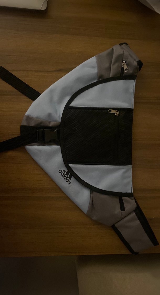 Gri Adidas omuz çantası, tokalı askı ve baskılı desenle dikkat çeker. Trendy casual ve athleisure tarzlara uygundur, çoklu fermuarlı bölmeleri vardır.