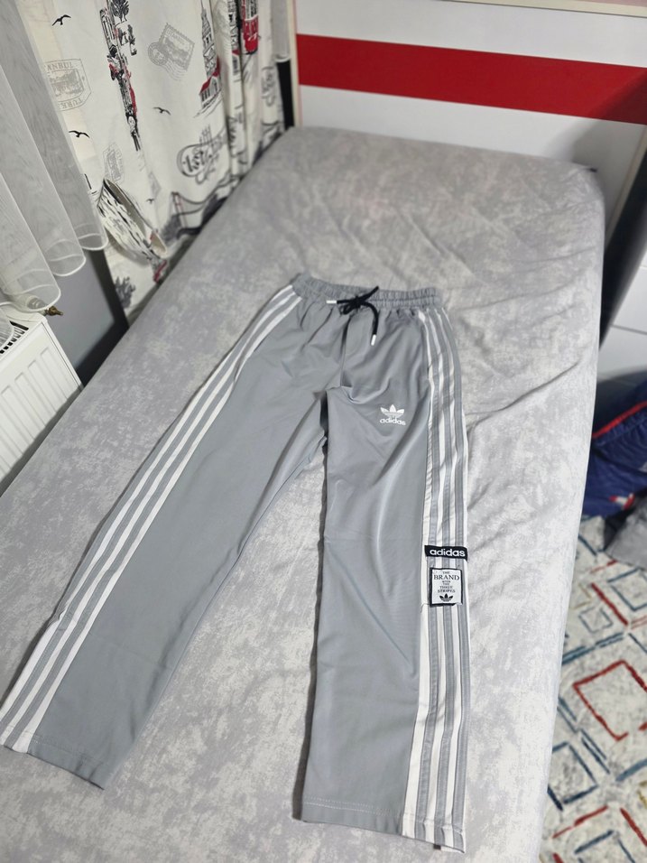 Gri Adidas sweatpant, yanlarda üç çizgili, bol kesim ve bağcıklı bel detayına sahip. Yumuşak ve rahat kumaşıyla spor ve salaş tarz sunar.