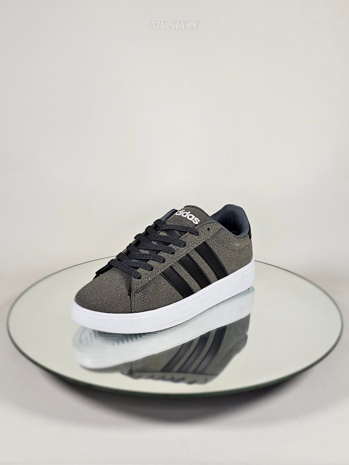 Gri renkli Adidas spor ayakkabı. Kauçuk taban dayanıklılık ve rahatlık sağlar.