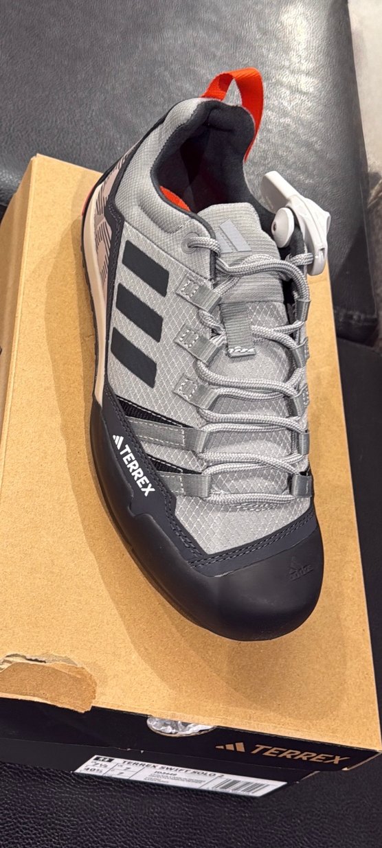Gri renkli Adidas Terrex 41 42 43.5 44 44.5 45.5 46 erkek outdoor ayakkabılar, baskılı desene ve bağcıklı yapıya sahip, dayanıklı kauçuk malzemeden üretilmiştir.
